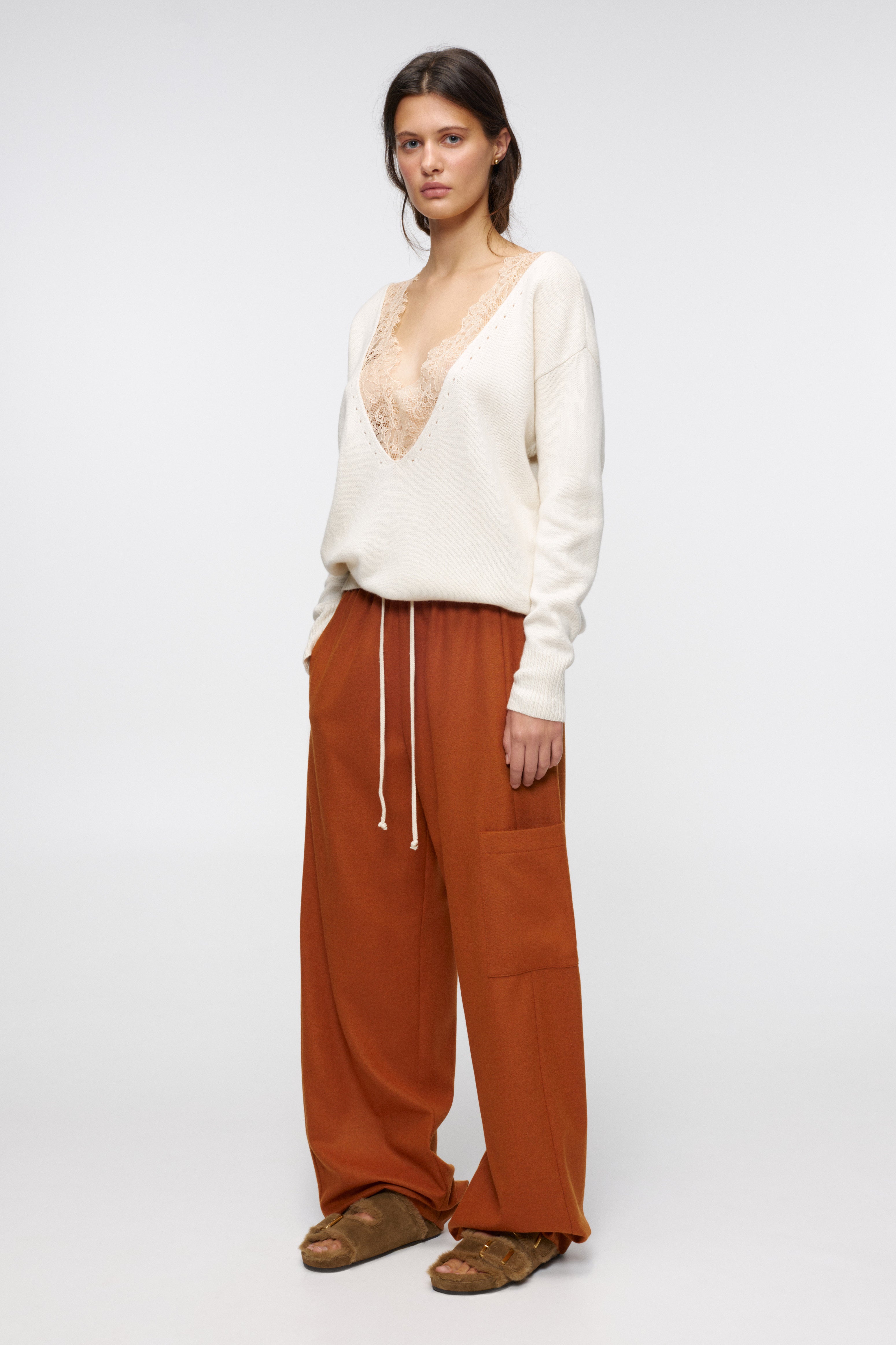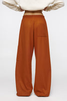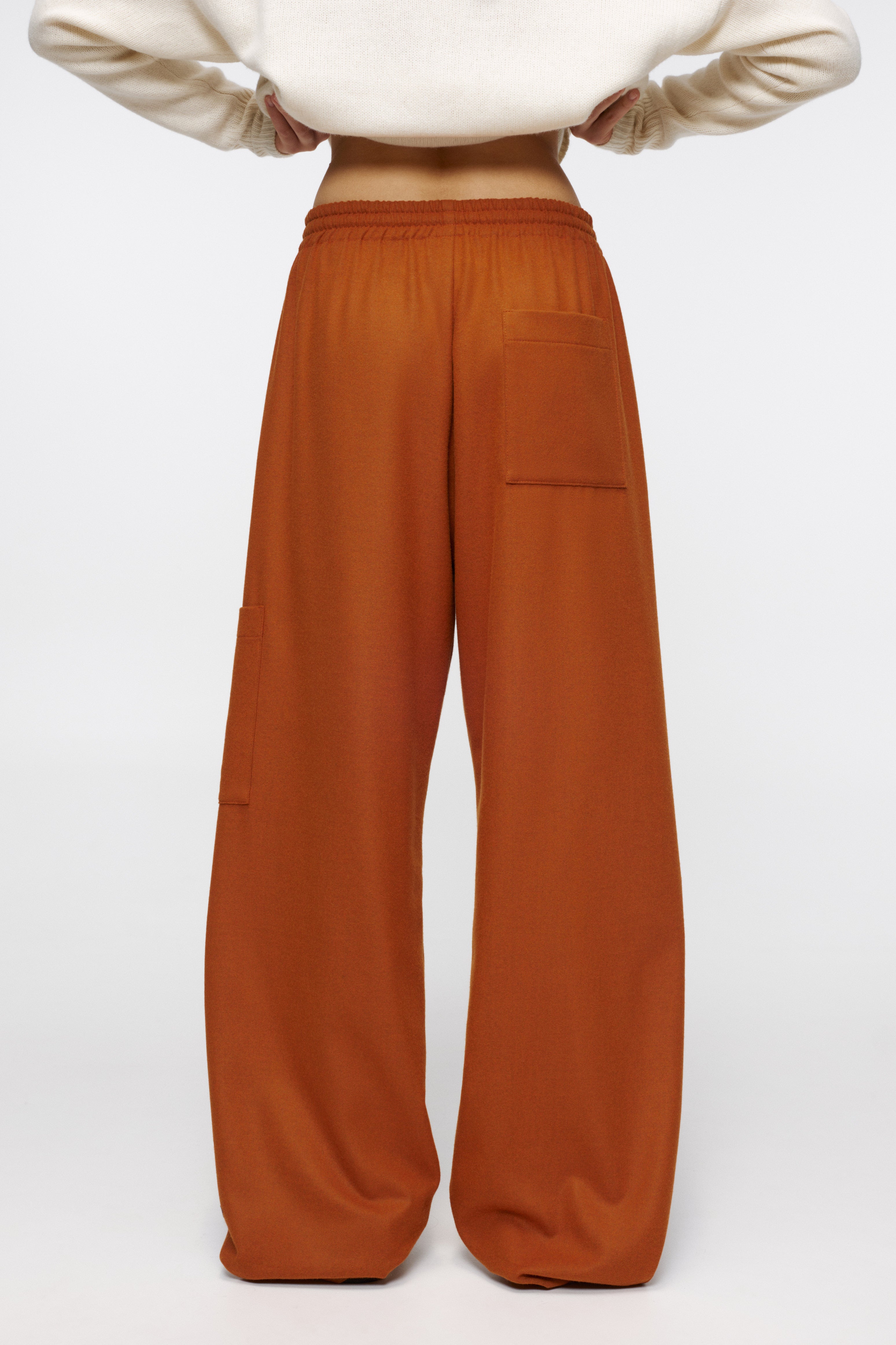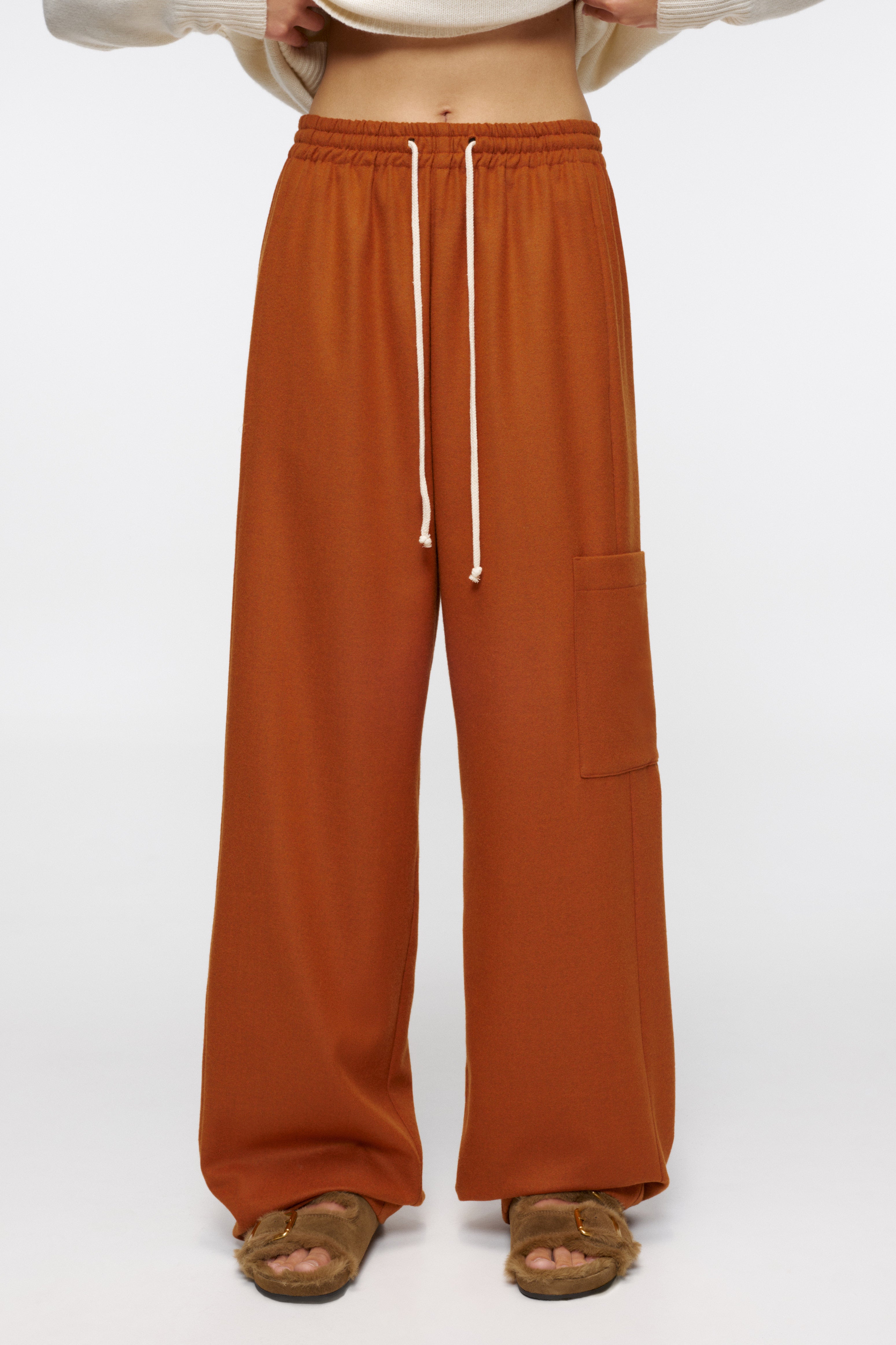 Комфортні штани вільного крою теплого рудого відтінку. Пояс на резинці з молочним бавовняним шнурком. Доповнені функціональними кишенями спереду та ззаду. Практична модель для створення затишних повсякденних образів. Виконані з м'якої костюмної тканини.
