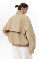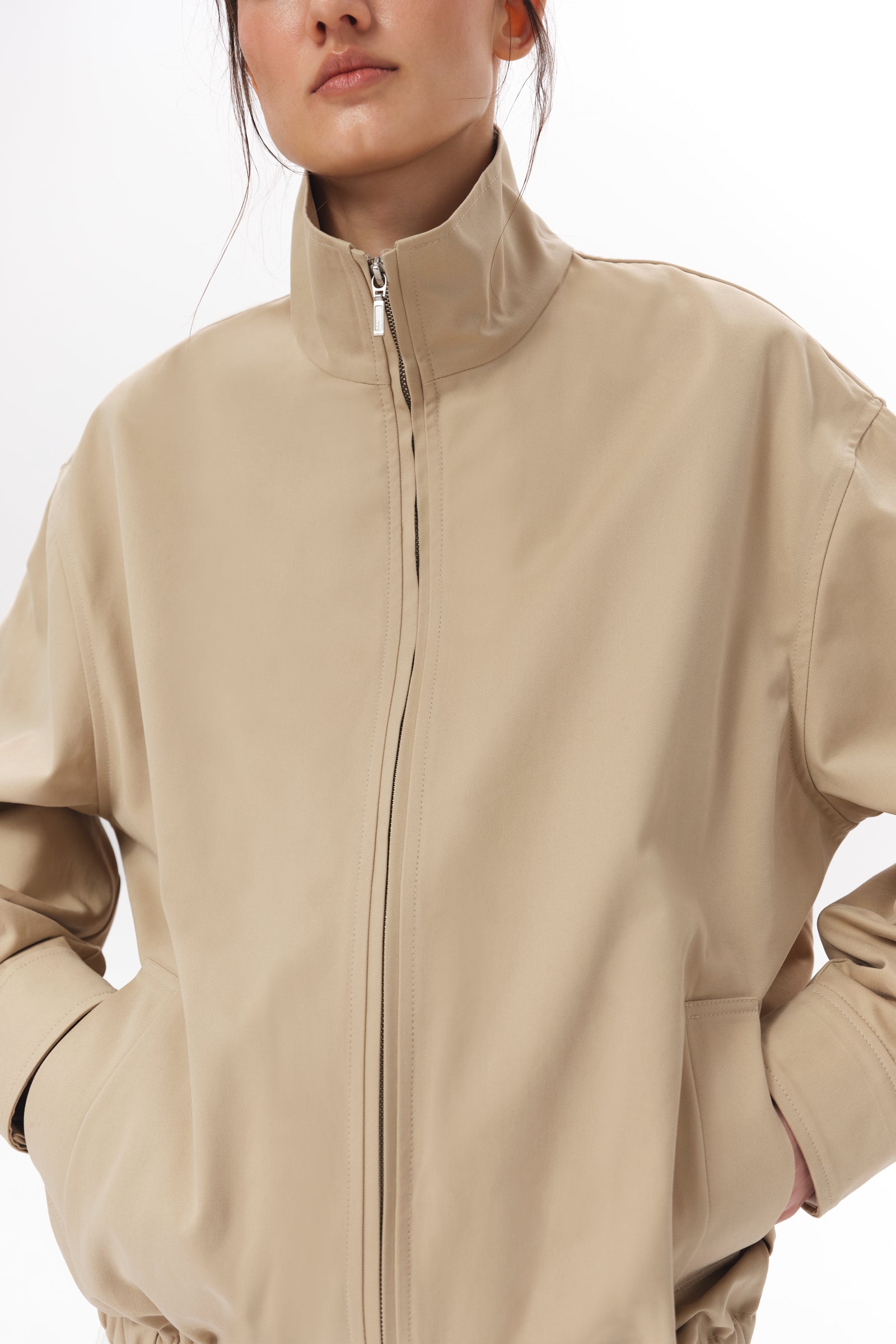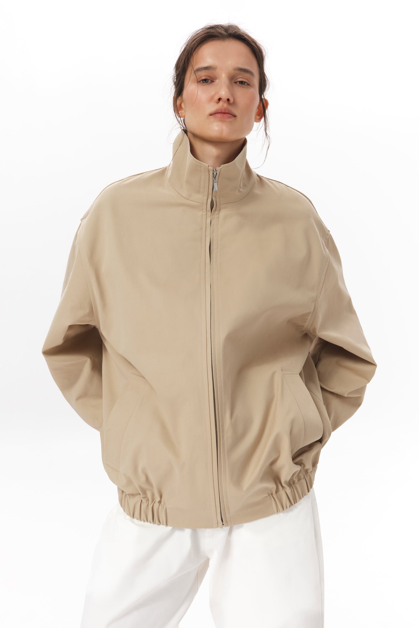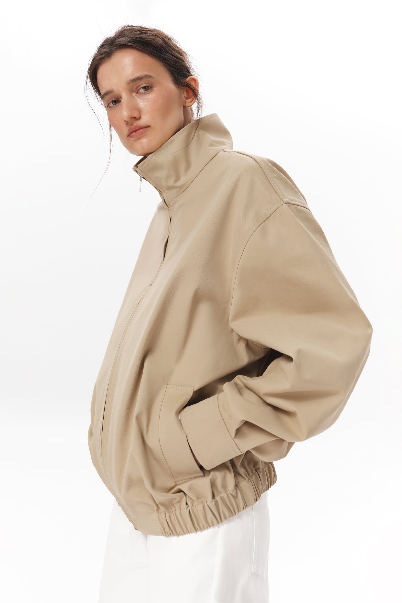 Структурована куртка-бомбер зі 100% бавовни. Щільна тканина добре тримає форму. Комір-стійка, центральна застібка на блискавці, бічні кишені. Пояс із вбудованою резинкою. На спині розташована кокетка, що додає об’єму силуету. Базова позачасова модель, яка легко інтегрується в гардероб.