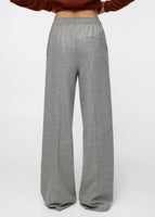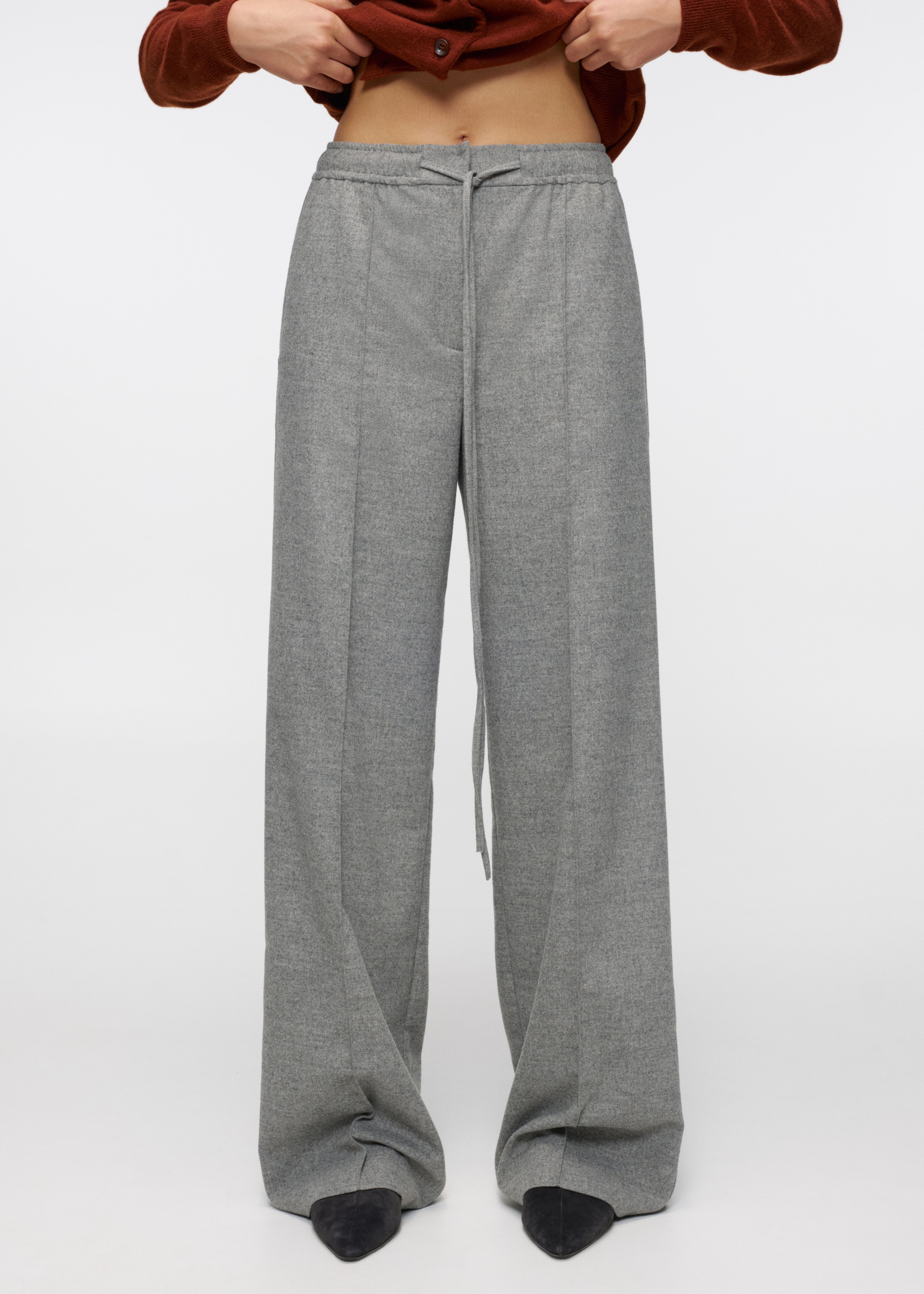 Елегантні штани прямого крою сірого кольору з прострочкою-кантом. Пояс на резинці, застібаються на блискавку та гачок. Доповнені функціональними кишенями. Універсальна модель для створення стильних ділових та повсякденних образів.