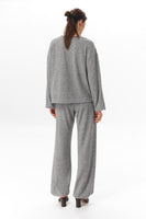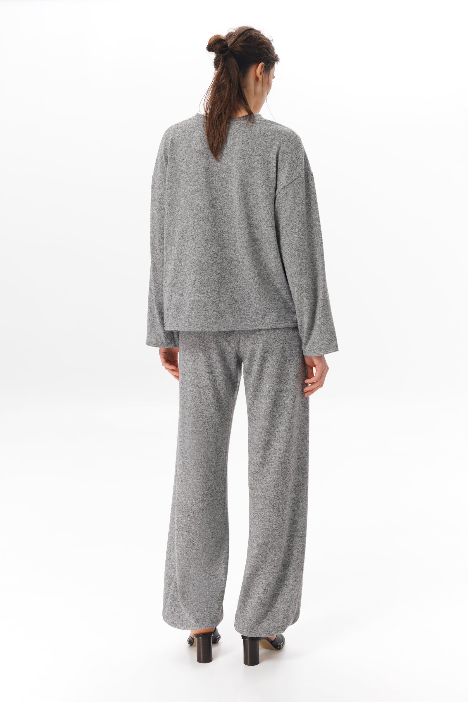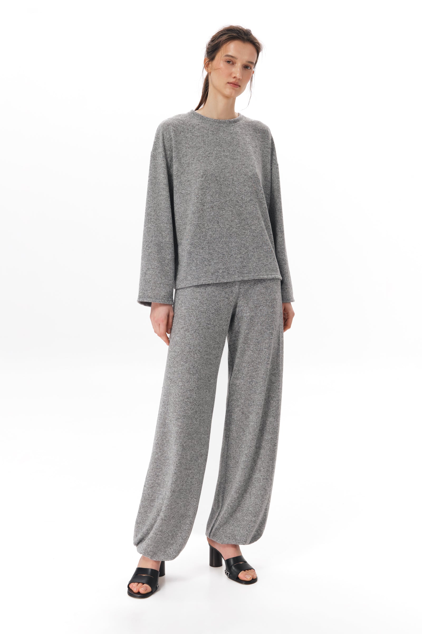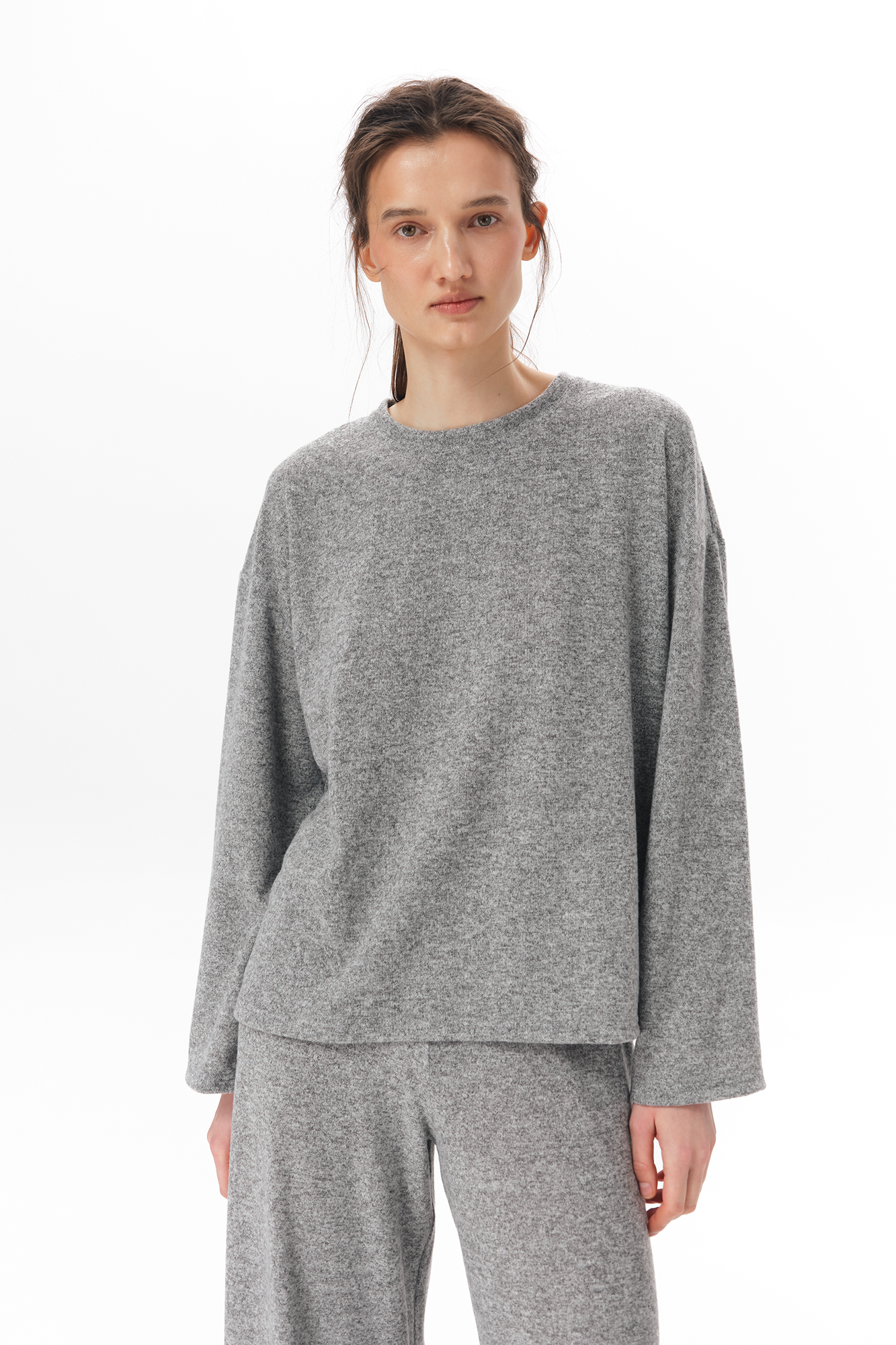 Трикотажний лонгслів з віскози з додаванням вовни. М’яка тонка тканина, легка й трохи тепліша завдяки вовняній нитці. Прямий вільний крій. Кругла горловина. Базова модель, яку можна носити окремо або як комплект із трикотажними штанами з цієї ж колекції.